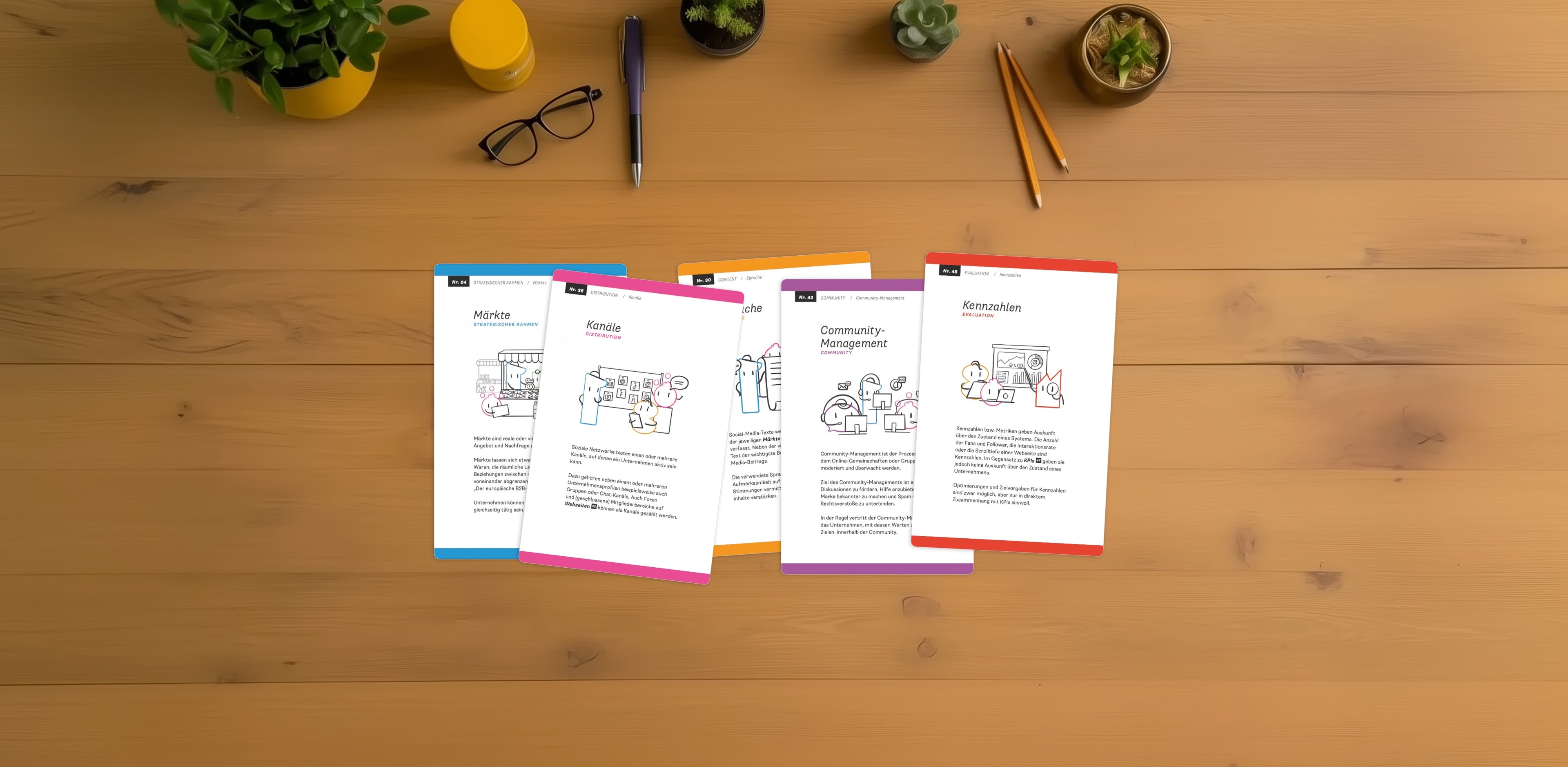 51 Karten mit kompaktem Wissen und praxisnahen Fragen, die dir helfen, eine erfolgreiche Social-Media-Strategie zu entwickeln.