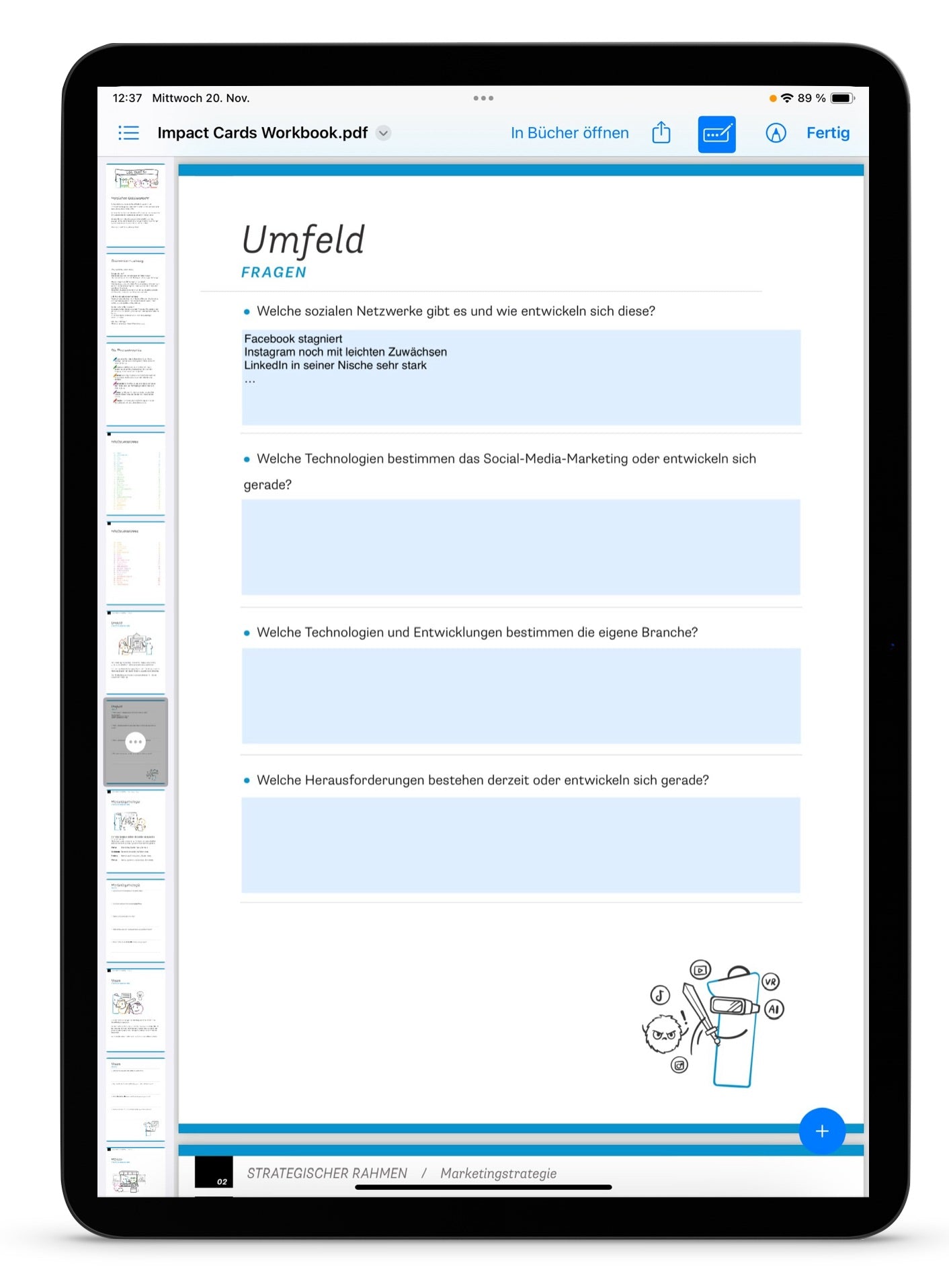 Mit den interaktiven Freitextfeldern kannst du deine Antworten direkt im Workbook festhalten und sicher speichern. Ob alleine oder im Team: Die Frageseiten bieten dir eine flexible und fundierte Grundlage, um Schritt für Schritt eine durchdachte Strategie zu entwickeln – individuell, praxisnah und in deinem eigenen Tempo.