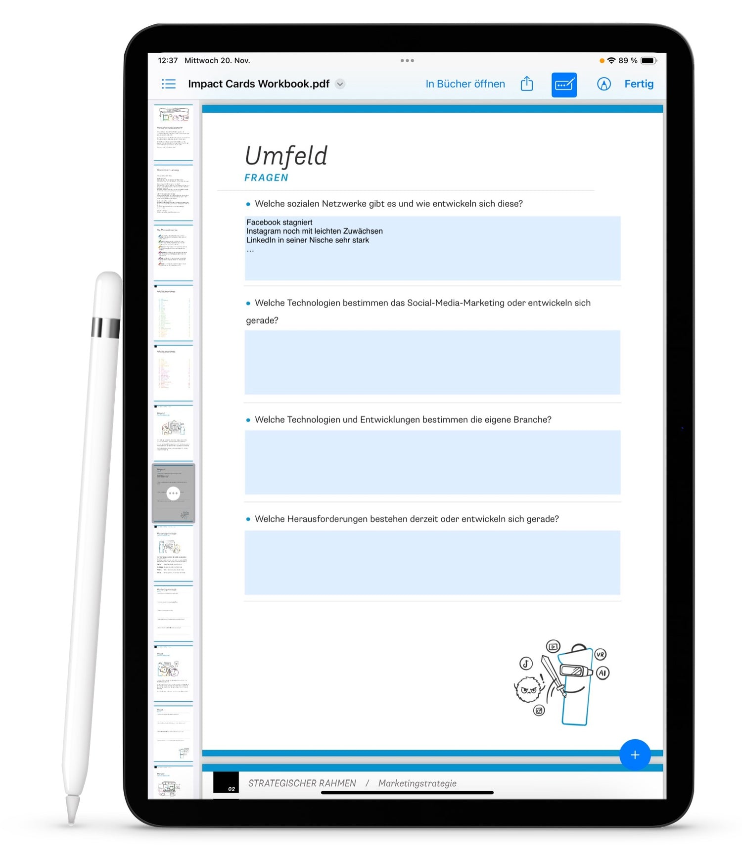 Das digitale Impact Cards Workbook bietet dir die Inhalte der analogen Box in einer flexiblen, interaktiven Form. Mit über 240 Fragen, klickbaren Querverweisen und Freitextfeldern ist es perfekt für alle, die ihre Strategie digital entwickeln möchten.